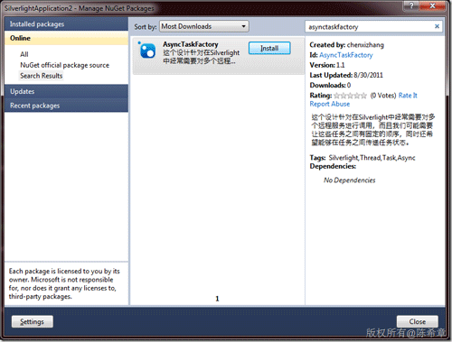 第一步:添加Nuget Package,关于什么是Nuget,请参考 //www.cnblogs.com/dudu/archive/2011/07/15/nuget.html
