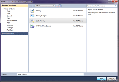 3. WF 4中,不再能直接使用Code Activity,如果希望写代码,则需要编写一个自定义的Activity,继承Code Activity
