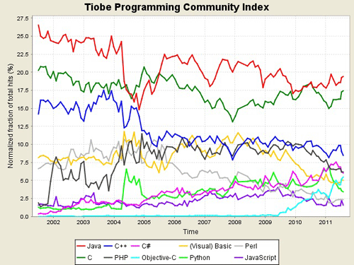 最终,一种新的函数型编程语言进入了Top 20.大多数人会认为热门函数型编程语言像Scala (#66), Clojure (#107), Haskell (#35) 或者是 Erlang (#48)等将会成为所有函数型编程语言的鼻祖Lisp的劲敌。但结果似乎是微软的语言F#,不过看看最近人气上升的F#,就没有什么好奇怪的了。作为一 种不错的程序设计语言,微软最新的Visual Studio 2010中也包含了F#。