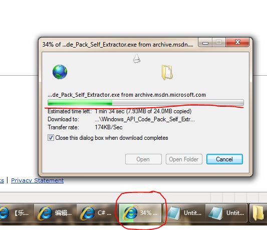 Windows7提供了许多不错的用户体验,诸如窗体背景透明、玻璃磨砂效果、任务栏的JumpList定义以及任务栏进度条显示等等。伴随着这些 特效的出现,Windows在底层也提供了相应的API支持,使得开发人员可以根据需要非常容易地在自己的应用程序中实现这些效果。如果你是原生的C++ 追随者,那恭喜你了!你完全可以毫无障碍地去使用这些API,前提是你需要阅读庞大的开发文档。如果你是新生的.NET开发人员(姑且还是将.NET developer称之为新生者吧,毕竟咱比C++出来得晚),也没有关系,微软在msdn网站中也发布了专门的Windows7 API托管类库,专门用于在.NET应用程序中调用。先来看看IE浏览器在Windows 7下下载文件时任务栏的进度条显示吧,相信很多人都不会陌生,如果你还闻所未闻,要么是你已经out了要么就是你从来就没有关注过Windows 7的这些细节。