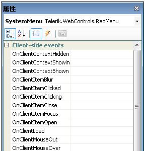 出了皮肤是一大特色外,RadMenu还提供了很多客户端事件,我们利用这些API可以很方便在在客户端通过JavaScript动态的来创建、添加、删除菜单项,如下属性截图: