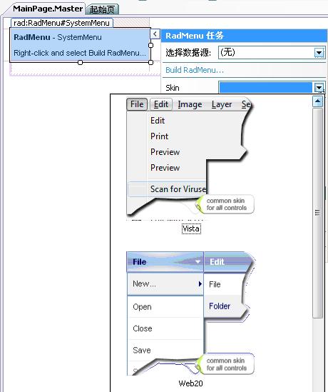 要使用RadControls提供的皮肤功能很方便,从安装目录下将皮肤文件复制到项目中,然后在控件上直接选择所需要的皮肤就OK。下图为RadMenu选择皮肤截图: