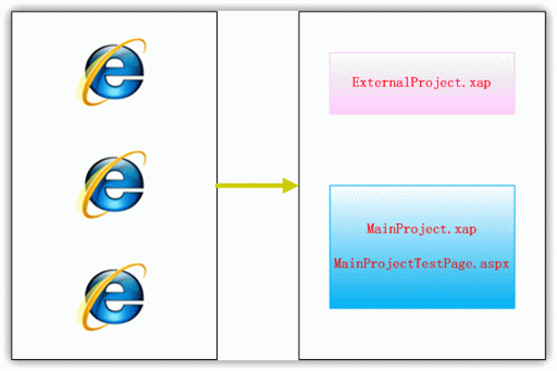现在我们先来看一下需求,大致是这样子的,在服务端我们有两个xap文件,其中MainProject.xap文件将会在 MainProjectTestPage.aspx中引用,而ExternalProject.xap文件中的UserControl将会在 MainProject.xap文件中访问,并进行显示,如下图所示: