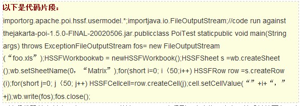 现在有了一个为Java开发人员提供能够真正创建Excel文件的方案。这就是一个称作POI(“可怜的混乱实现”)的新的Jakarta项目组中最成熟的部分。POI中Excel组件命名为HSSF(“可怕的电子表格格式”)。