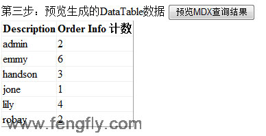 (4)在页面后置代码中,编写相应的事件代码,代码很简单,但是这里要说明的是,FusionChart可以采用两种在网页中呈现数据,一种是生成一段JS代码,一种是直接生成一段Flash的HTML代码。点击预览DataTable后的结果如下所示(是不是和我们刚开始的MDX测试结果一致?):