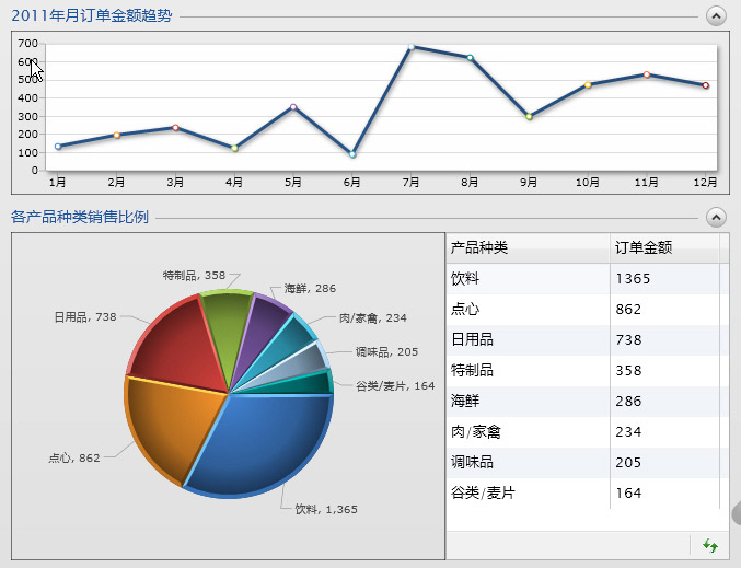 概述:本示例完美的展示了EVCombo for Silverlight基础控件套包中各个组件的无缝整合和使用,并实现了订单数据的分析和管理功能,其中包括订单数据的呈现,新增订单,订单月销售额与产品销售情况的分析及订单报表的打印等功能。
