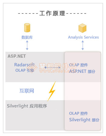 RadarCube ASP.NET Silverlight OLAP控件是一个"双重"控件,第一部分是在Silverlight应用程序中负责可视化,第二部分是无形的 - 它在ASP.NET页面中负责OLAP计算。 无形的ASP.NET控件是一种能处理大量重要数据的"Web服务"排序方式,当进行OLAP计算时,它为Silverlight 应用程序提供有用数据可视化的有效转换。