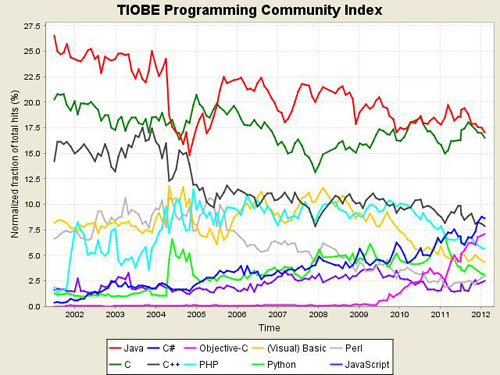 TIOBE 2012年 2 月编程语言排行榜已经发布,本月 C# 挤进前三,占领季军位置,C++降至第四名。Visual Basic 惨遭冷谈,呈现下滑趋势;而 VB.NET 受到了开发者们的追捧,进入榜单前 20 名,从上个月的 24 位跃至16位。从走势图中可看出,Objective-C依然发展迅猛,荣膺 2011 年度语言桂冠。其他编程语言值得关注的有:Groovy 逐渐逼近榜单前 20,CFML(ColdFusion)回归至 Top 50,排名 44 位。