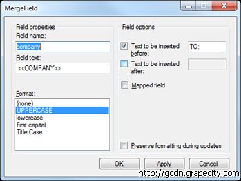 在这个对话框中,可以处理MergeField的所有属性,选中“Text to be inserted after”复选框,然后输入相应的文字,这些文本将被插入到该字段的后边,点击【OK】按钮关闭设置该设置对话框。