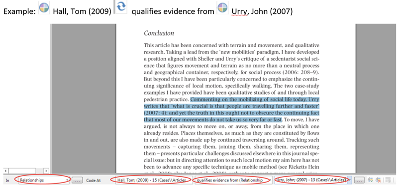 您可以使用关系节点来编码您的文章之间的关系。当你打开一篇文章后,您可以用快速编码工具栏编写左端文章关系情况、中间的关系类型以及特指的文章及案例。如果尚未创建案例或关系,只需在指定框中键入新项目的名称即可,如下图所示: