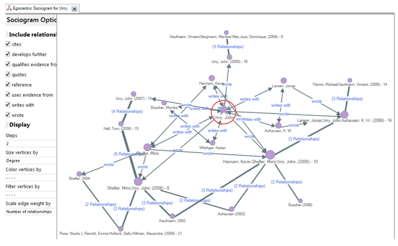 从下面的Network Sociogram中可以看出,Hall(2009)和Urry(2007)之间有四种关系,当我双击该线时,弹框会打开,向我展示这四种关系是什么。如果我选择任意一个并点击确定,带有详细信息的参考文章将在视图中打开,如下图所示:
