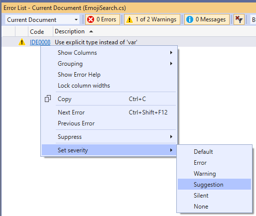 现在可以直接通过错误列表配置代码样式规则的严重性级别。将光标置于错误、警告或建议上,右键单击并选择设置严重性。接下来,选择要为该规则配置的严重性级别。这将使用规则的新严重性更新现有的EditorConfig。它也适用于第三方分析程序。