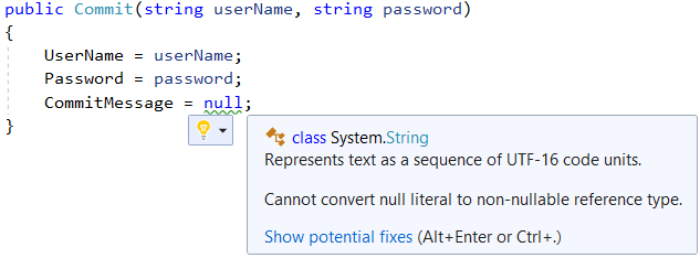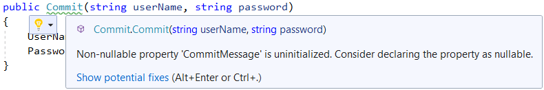 仍然会显示警告。现在,通过将其声明为可为空的字符串(string?),使CommitMessage属性接受null。