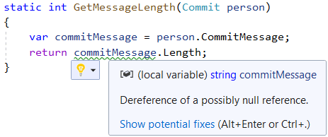 </font></font>尝试访问CommitMessage的长度时,警告将消失,并且新警告将显示在Program.cs类中。