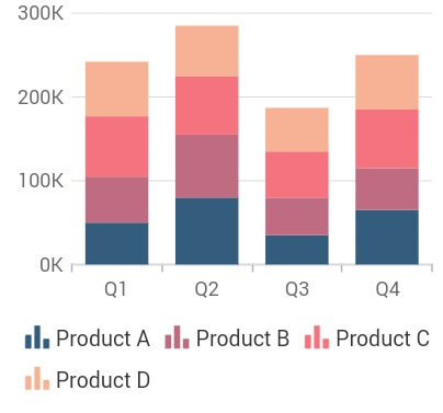 堆积柱形图允许您通过在垂直条形图中绘制数据点,进行部分到整体的比较。下面的代码演示了如何呈现堆积柱形图: