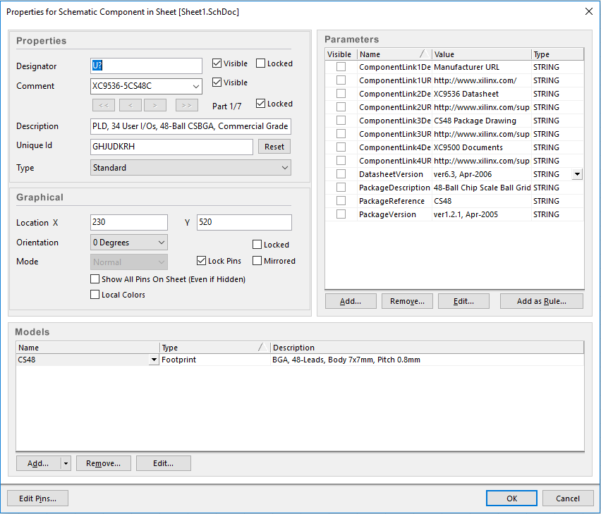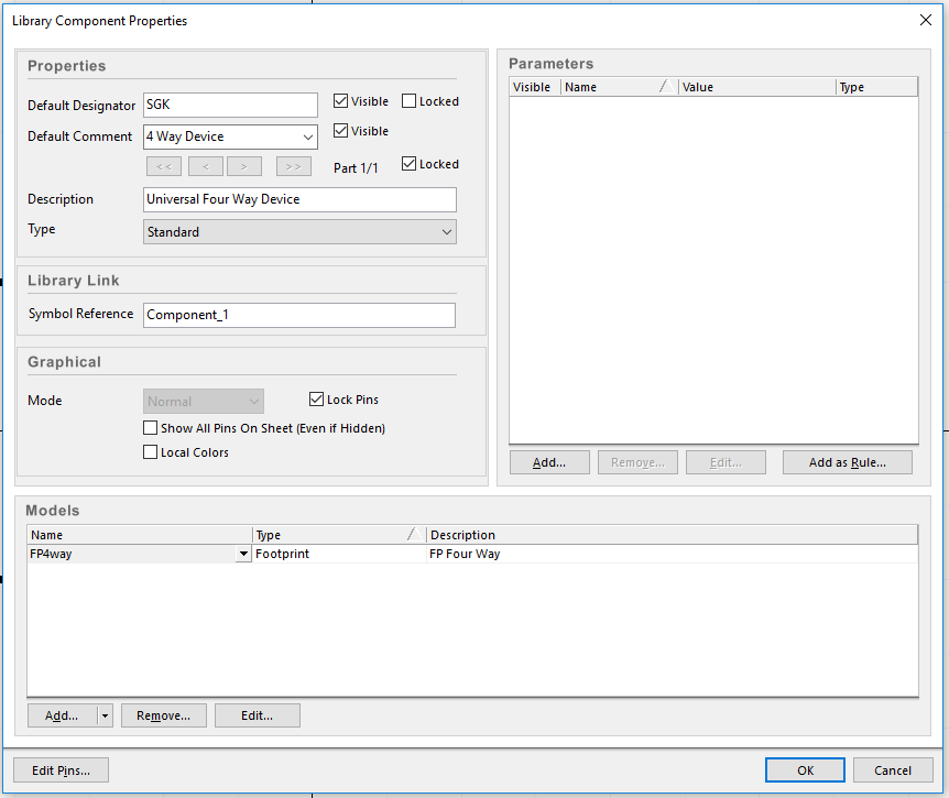 围绕原理图的符号创建一个组件。使用上面的示例,在打开其组件属性时,我们将看到该组件的属性,参数和模型: