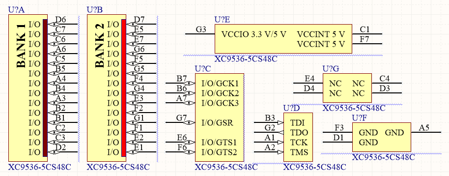 以Xilinx库中的XC9536-5CS48C为例,该设备有七个单独的符号(从A到G)表示其示意图: