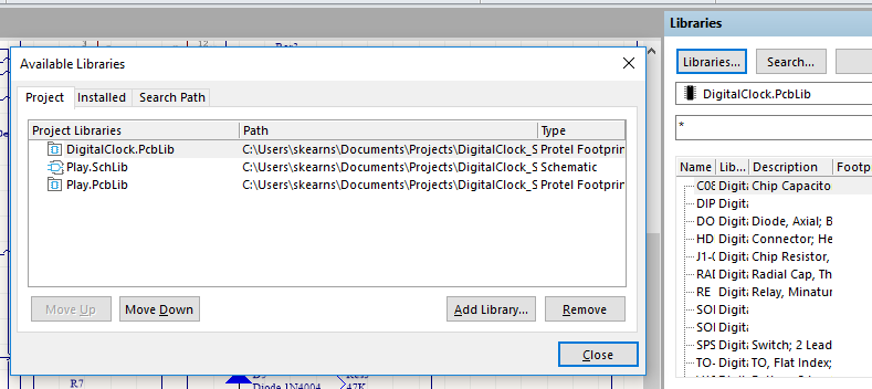 这些库可以直接添加到当前项目中,在这些项目中它们的顺序决定了它们的影响力。已安装的库列出了可用于工作空间的库,即从系统级别可用于项目的库,因此可用于所有项目。在原理图中添加了零件(组件)。