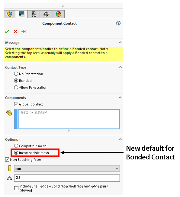 Solidworks Simulation 2020通过将“键合触点”设置默认值从“兼容”网格更改为“不兼容”网格,向前迈出了一大步。这项更改使对没有接触面的装配体进行网格划分比以往更加容易,这是现实世界中常见的设计场景。设计人员将体验到减少预处理时间所带来的巨大好处。