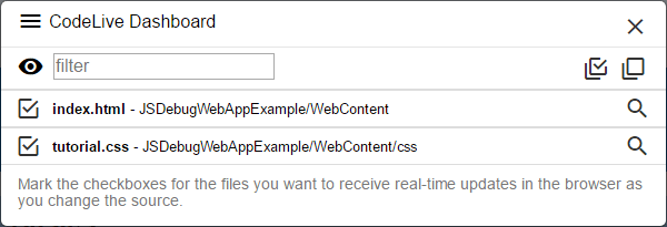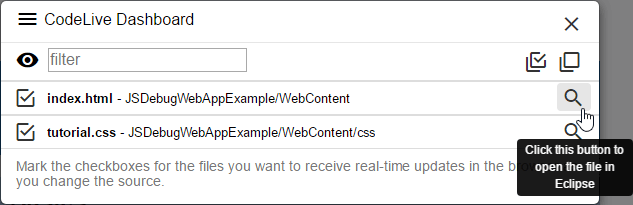 CodeLive将浏览器连接到IDE。您可以选择为每个Java EE服务器打开CodeLive,也可以选择要在Java EE网站的浏览器中实时预览的文件。