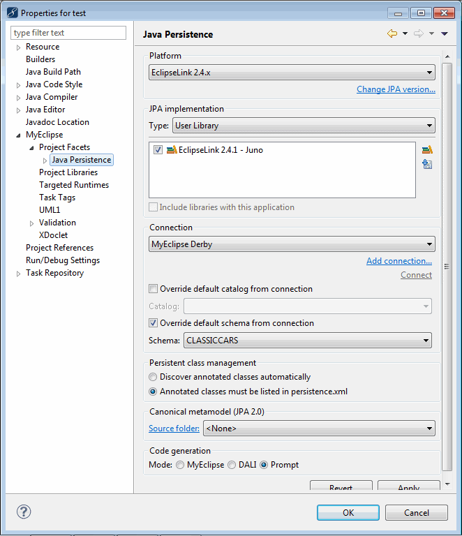同时,您还可以右键单击该项目从菜单中选择“Properties”,展开MyEclipse > Project Facets,然后选择Java Persistence,打开Java Persistence properties页面随时更改JPA项目的数据库驱动程序关联。