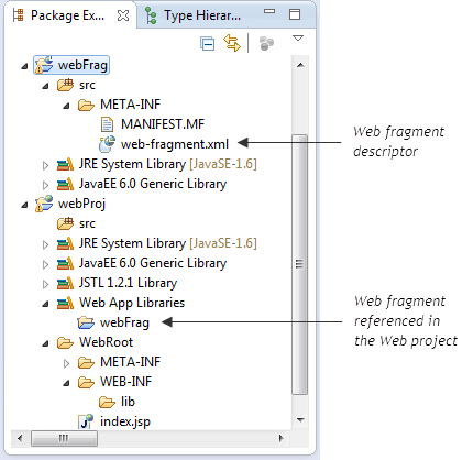 下图显示了Web项目中包含的Web Fragment项目结构的注释视图。在Web Fragment项目中,您可以在src/META-INF文件夹中看到web-fragment.xml描述符。在Web项目中,您可以看到Web Fragment项目中的库被引用了。