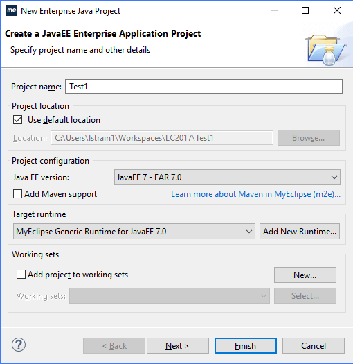 注意:如果出现Migration向导,单击Next>单击Finish,将项目迁移到MyEclipse版本。