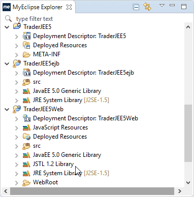 完成向导后,将创建并配置五个MyEclipse项目:Test1、Test1Client、Test1Connector、Test1EJB和Test1Web。
