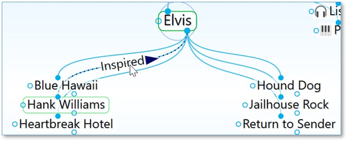 例如,对于链接标签“Inspired”(如下所示),链接的方向箭头显示“Hank Williams”是Elvis的灵感来源。当您希望表示项目之间的流(如财务关系)时,这也非常有用。