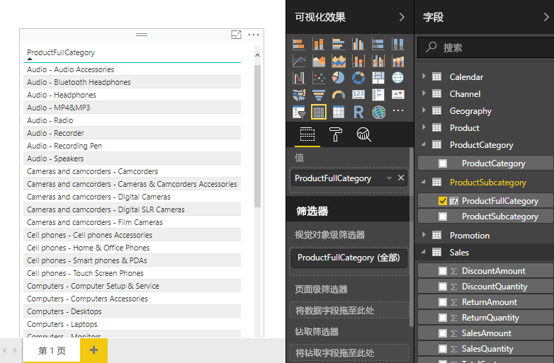 从“ProductSubcategory”表选择“ProductFullCategory”列或或将其拖放到报表画布,来创建一个显示所有ProductFullCategory名称的表。
