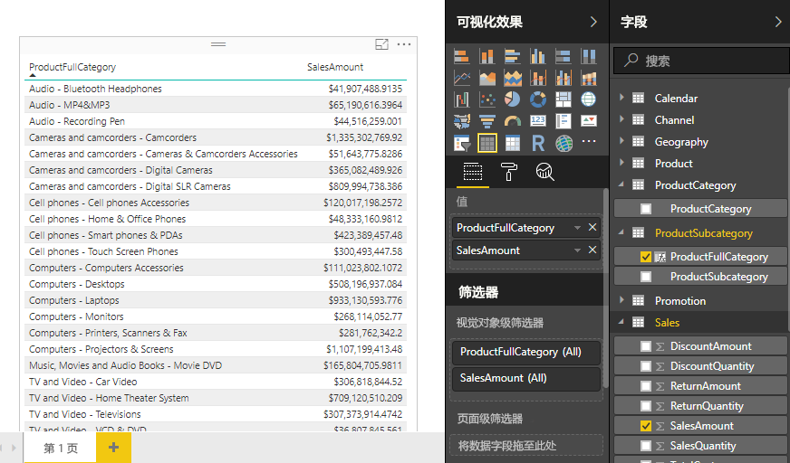 2、从“销售”表选择“SalesAmount”字段或将其拖动到表,以显示每个产品完整类别的销售额。