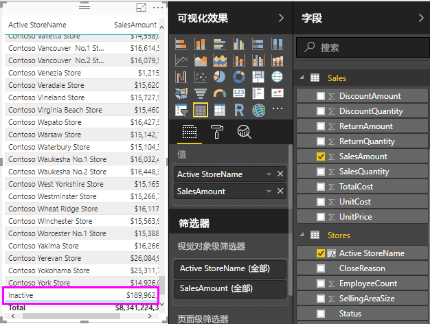 7、和其他任何字段一样,可以在可视化效果中使用新的Active StoreName列。若要显示按Active StoreName排列的SalesAmounts,选择“Active StoreName”字段或将其拖至画布,然后选择“SalesAmount”字段或将其拖至表中。在此表中,活跃商店单独按名称显示,而非活跃商店以“非活跃”组合到末尾。