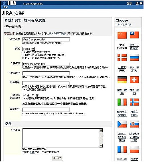 安装好之后就首先要在服务器上通过//localhost:8080为服务进行配置(8080是 Jira的端口),具体需要经过三个步骤完成:
