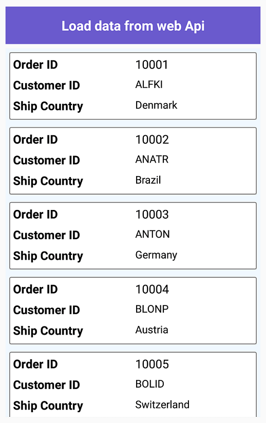 <ContentPage xmlns="//xamarin.com/schemas/2014/forms" xmlns:x="//schemas.microsoft.com/winfx/2009/xaml" xmlns:local="clr-namespace:SfListViewSample" xmlns:syncfusion="clr-namespace:Syncfusion.ListView.XForms;assembly=Syncfusion.SfListView.XForms" x:Class="SfListViewSample.MainPage" Padding="10"> <syncfusion:SfListView x:Name="listView" ItemSize="90" ItemSpacing="5" Grid.Row="1" BackgroundColor="AliceBlue" ItemsSource="{Binding Items}">输出