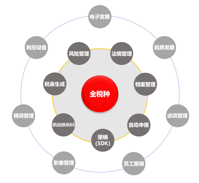 包括销项管理、进项管理、供应链协同管理、增值税申报管理,以及18个税种的申报表生成、一键申报、风险评测与控制、税负分析、税收筹划、政策法规库等。