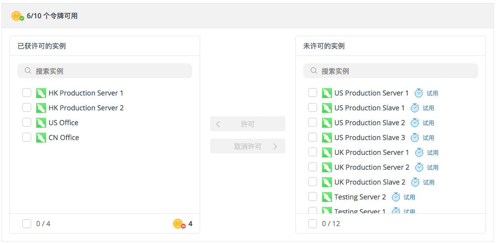 在“#/ # 个令牌可用”部分,所有未许可的实例都显示在“未许可的实例”列表,而所有已获许可的实例则显示在“已获许可的实例”列表。你可以将可用的令牌分配给未许可的实例,选择未许可的实例并点击“许可 >”按钮。如果你想释放令牌以许可其他实例,请选择一个已获许可的实例并点击“< 取消许可”按钮。