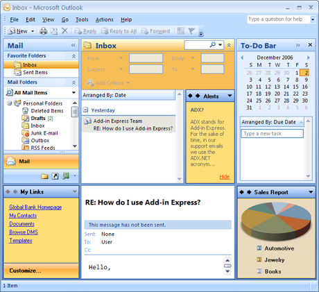 在2007版本中,高级Outlook自定义功能为您的Outlook plug-ins提供了一个独特的图形用户界面。现在您可以在Outlook的窗口中使用任意的.NET窗体和控件,比如在Outlook的查阅窗口、电子邮件窗口、任务窗口、行程提醒窗口、导航面板、立即工具条等。所有的Outlook版本多支持透明效果。