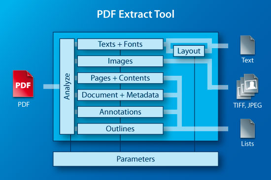 3-Heights® PDF Extract is a highly efficient and versatile PDF content and metadata parser and extractor. It constitutes the technical foundation of many solutions: from basic PDF to Text conversion to complex solutions in the area of business intelligence, big data and reporting. It allows a precise and throrough conversion of binary data (PDF) to structured information, e.g. in Unicode, images and metadata. The product provides page-wise extraction via command line or more complex operations using its API, e.g. with C#, Visual Basic, Java or C/C++.