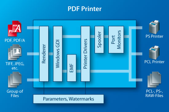 The 3-Heights™ PDF Printer is an efficient and practical solution for automated background printing of PDF documents on all Windows printers including PostScript and on virtual printers. A variety of options are available for printer control.