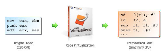 当 一个软件破解者尝试对一组受到 Code Virtualizer 保护的代码进行 反编译时,他无法找到任何本来的 x86 指令,而只会发现一个他或其它特别的 反编译器 完全陌生的、新的指令集。这将迫使 软件破解者使用非常多的努力来研究每一行的代码的意思以及学习每一个受保护程序内的虚拟机器的运作原理。 Code Virtualizer 完完全全地对虚拟码的运行以及个别虚拟机器的学习进行了搅乱,以阻止任何人学习当中的虚拟码是如何运作的。