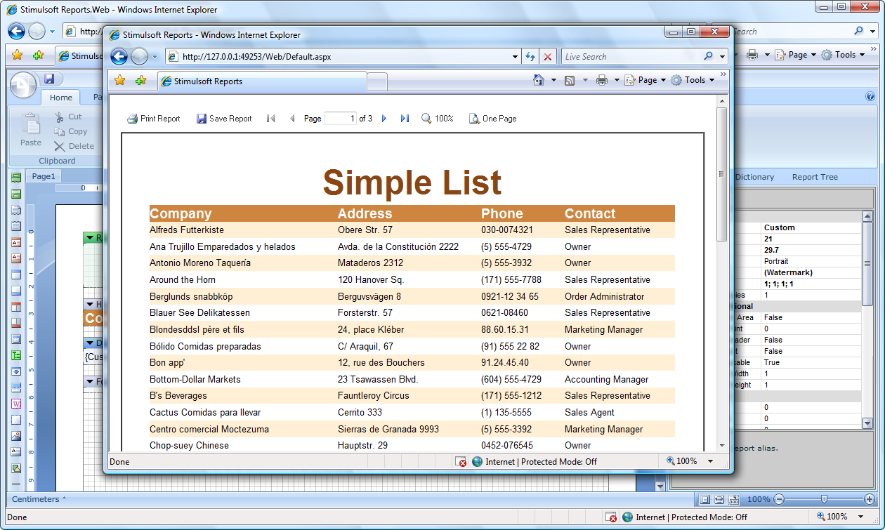 When you create a report in Stimulsoft Reports.Web there is no need for you to worry about how your clients will see this report. You can view a report in the window of a browser. You can print a report. You can export a report to more than 20 formats: PDF, XPS, Excel, Word, HTML, RTF, XML etc. All this can be done both in Ajax-based report Web Viewer and directly from a code of the web application.