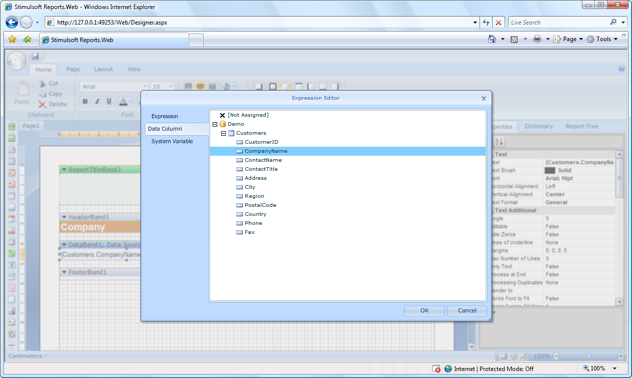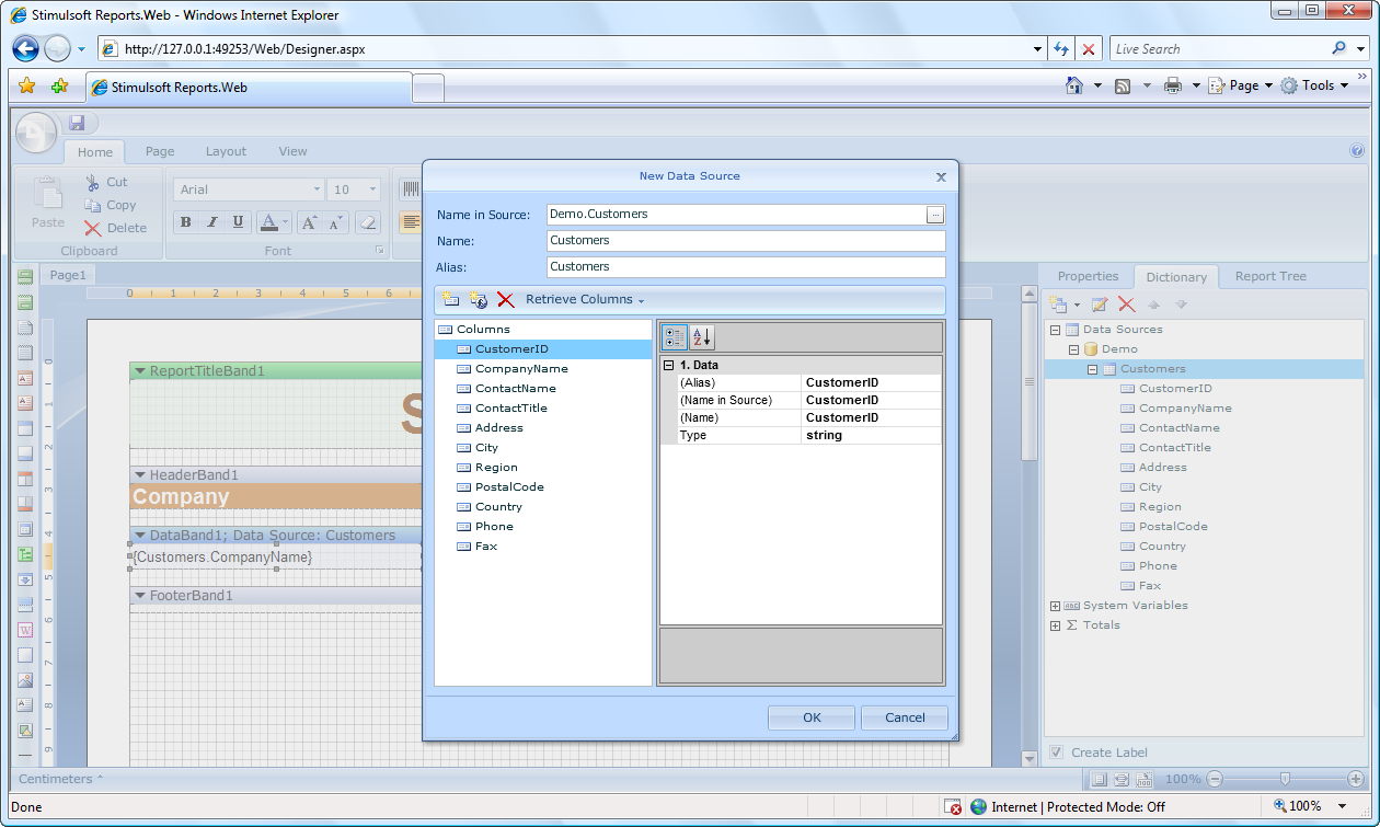 For the first time a report generator gives you an opportunity to edit reports in the window of a web browser. The only requirement is a web browser and Flash Player 9. If your client has web browser and Flash Player 9 Stimulsoft Reports.Web will work! It is simple on the client and what about the server? It is simple too. All you need is to put a simple non-visual ASP.Net component on a web page and call the Design method in any event of a page. Then, one string of a code is enough to run our designer in a browser. That’s all! It is very hard to create dynamic application for Web. And on what level is Stimulsoft Reports.Web done? The answer is simple – on the highest level. Ribbon interface, visual component builder, clipboard, table editing, zooming, and multiple other functions for convenient and quick report editing. Here yo