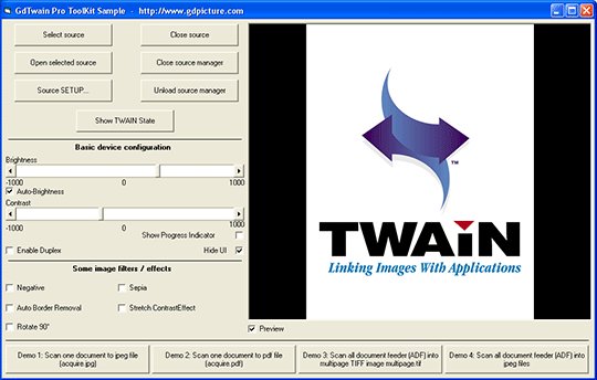 GdTwain Pro SDK is powerful an easy to use ActiveX component to control TWAIN devices such as scanners, digital cameras and capture cards. It also provides a full featured Image Viewer control. With GdTwain Pro SDK you can fully control the image acquisition process, scan images from an automatic document feeder, clean up images, enhance image applying filters like auto border removal, Despeckle, automatic deskew and more. GdTwain Pro SDK can save images to disk or upload to FTP server.