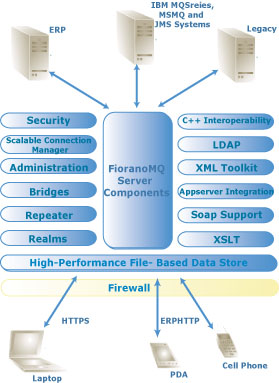 FioranoMQ is the world’s first grid-enabled, peer-to-peer JMS messaging platform, with powerful and unique features including dynamic routing, distributed debugging of message flows, dynamic deployment of JMS client applications, unbounded scalability, direct invocation of standards-based JCA components and unparalleled ease-of-management with JMX standards. Rated at over 50,000 messages/second in closed benchmark testing, FioranoMQ is also the world’s fastest standalone standards-based messaging server.
