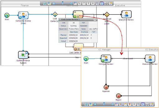 BizFlow超出了简单的图形化的流程工作项的显示。工人和管理人员可以很容易地从一个流程图发现重要的处理细节,如已用时间,在截止日期之前认为完成的实例,以及在处理的实例总数。