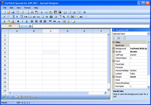 You can easily assign cell types, color, text, etc for any cell using the Spread Designer’s unique WYSIWYG implementation. This allows for faster design of your applications by your developers or you can even give the Spread control to your graphic designers to configure and create “skinsEthat can be used across multiple spreadsheets or even across multiple applications for a consistent look. Below is a screenshot of the Spread Designer: