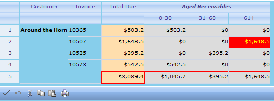 Spread includes a powerful calculation engine that allows you to quickly add formulas to your web applications by using any of over 300 pre-defined functions or you can add your own custom functions. Spread also supports cross-sheet formula referencing. In the below sample, formulas are in the 'Total Due' column and the last totals row. Enter or change a formula in a cell - "=SUM(A1:A3)" - then press the Update image link (the checkbox at the bottom left of Spread) to view your changes.